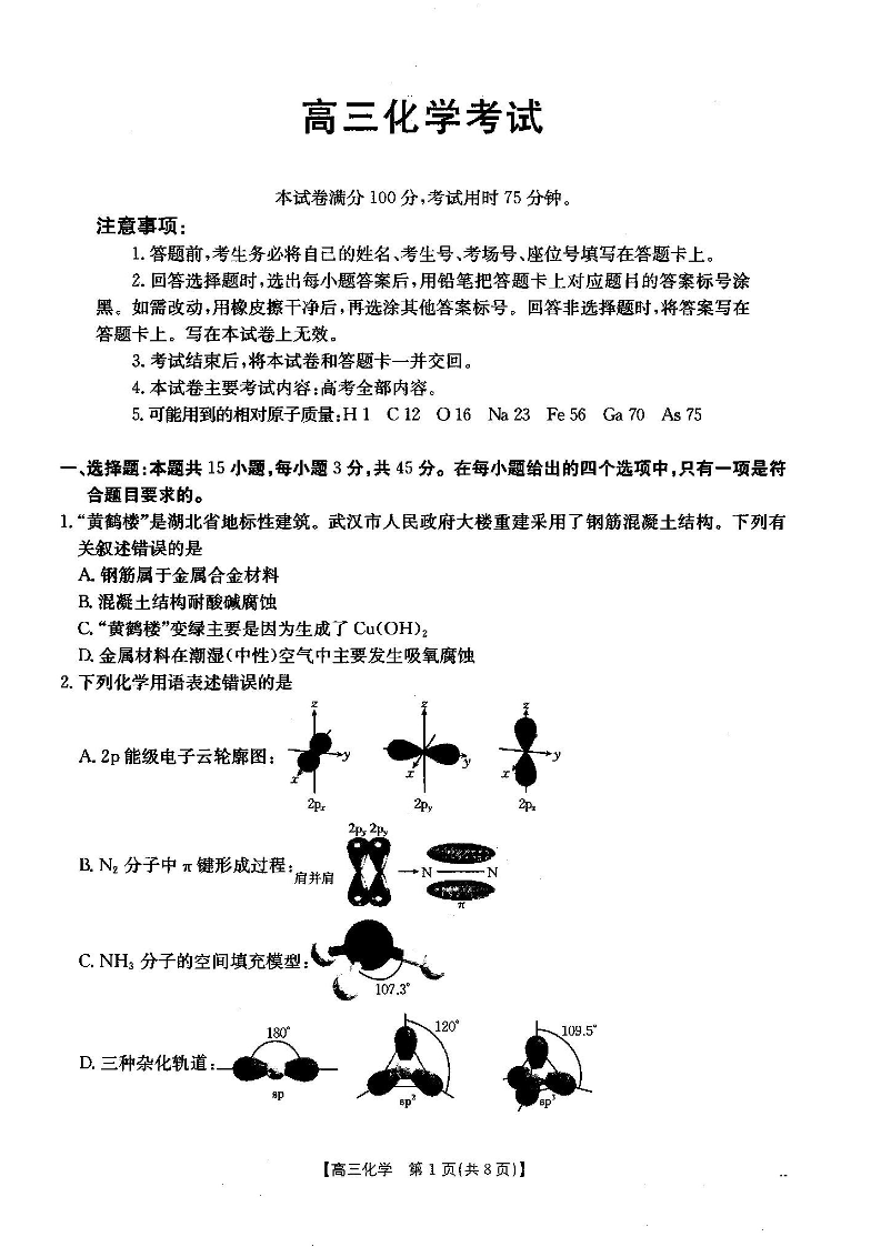 湖北省部分学校2024-2025学年高三上学期12月联考 化学