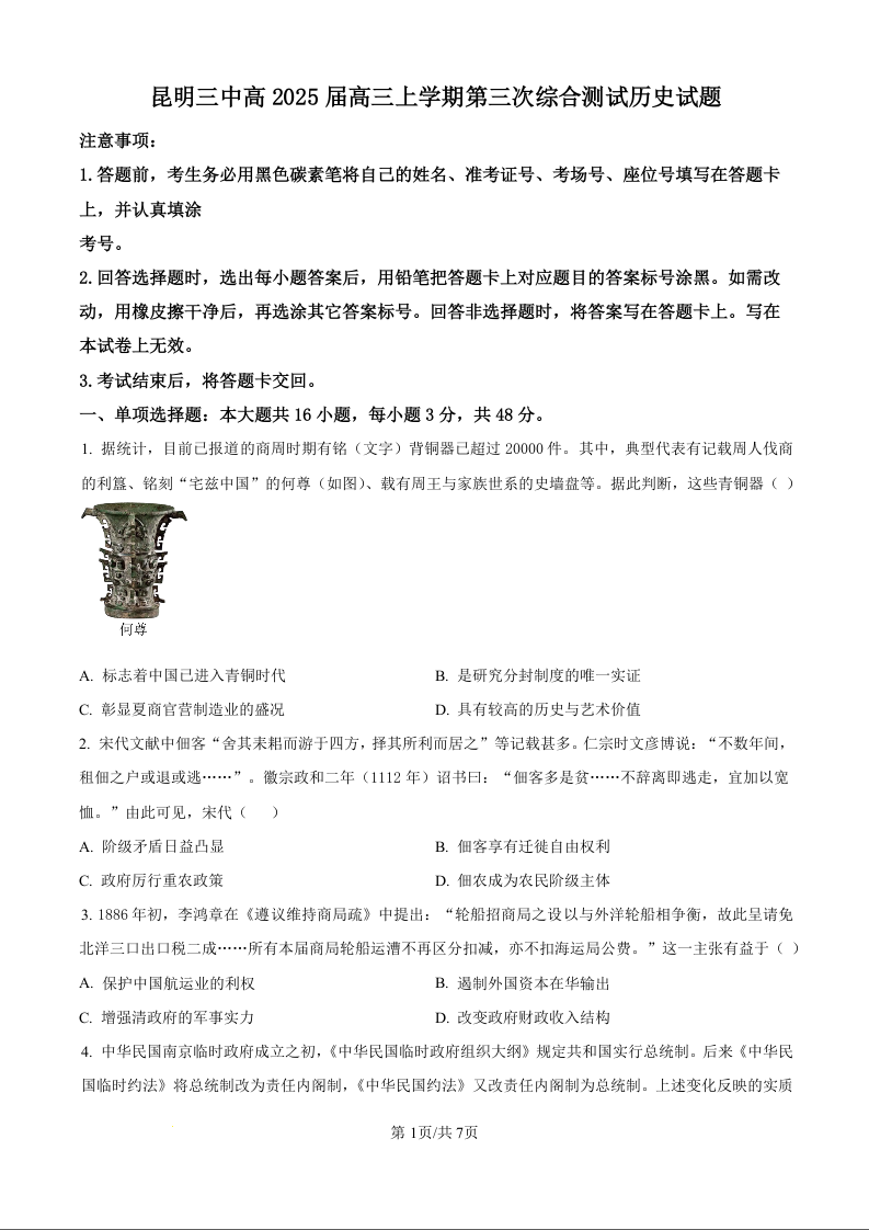 昆明三中高2025届高三上学期第三次综合测试 历史