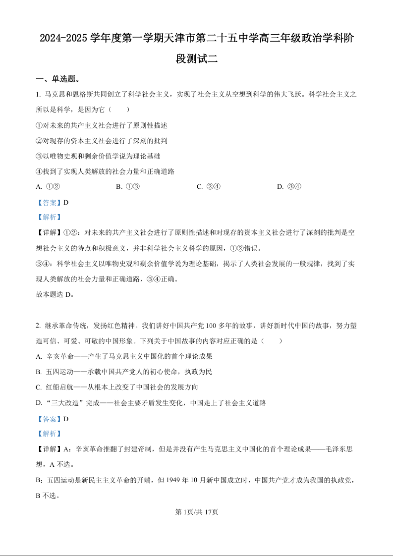 天津市第二十五中学2025届高三上学期第二次月考 政治