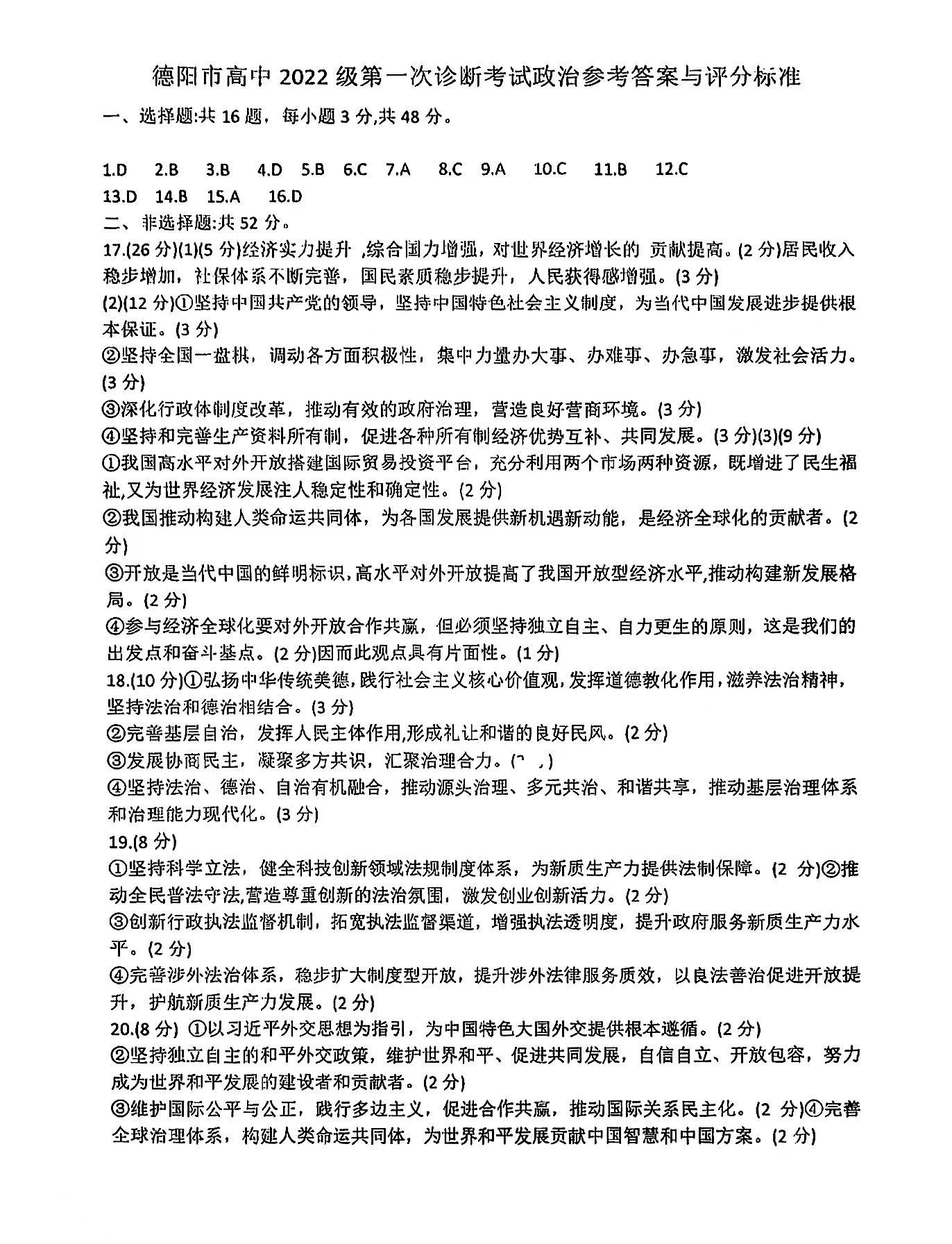德阳市高中2022级第一次诊断考试 政治答案