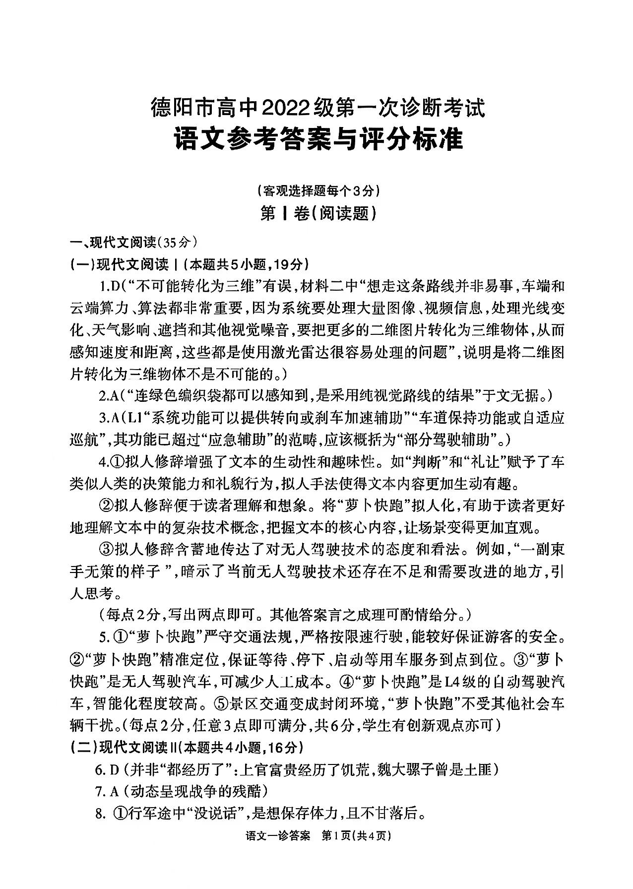 德阳市高中2022级第一次诊断考试 语文答案