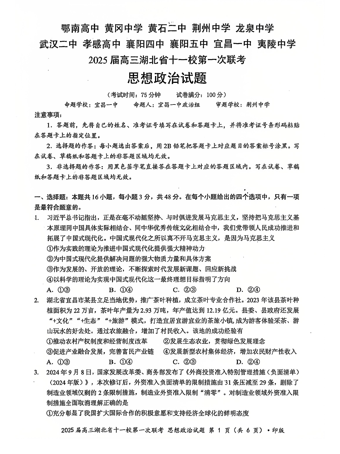 2025届高三湖北省十一校第一次联考 政治