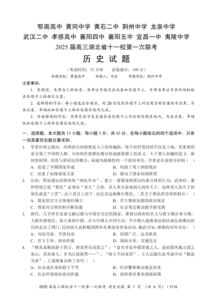 2025届高三湖北省十一校第一次联考 历史