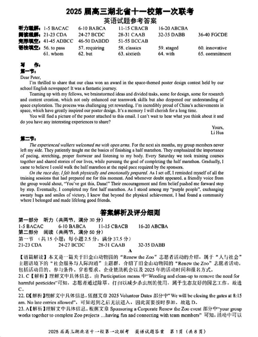 2025届高三湖北省十一校第一次联考 英语答案