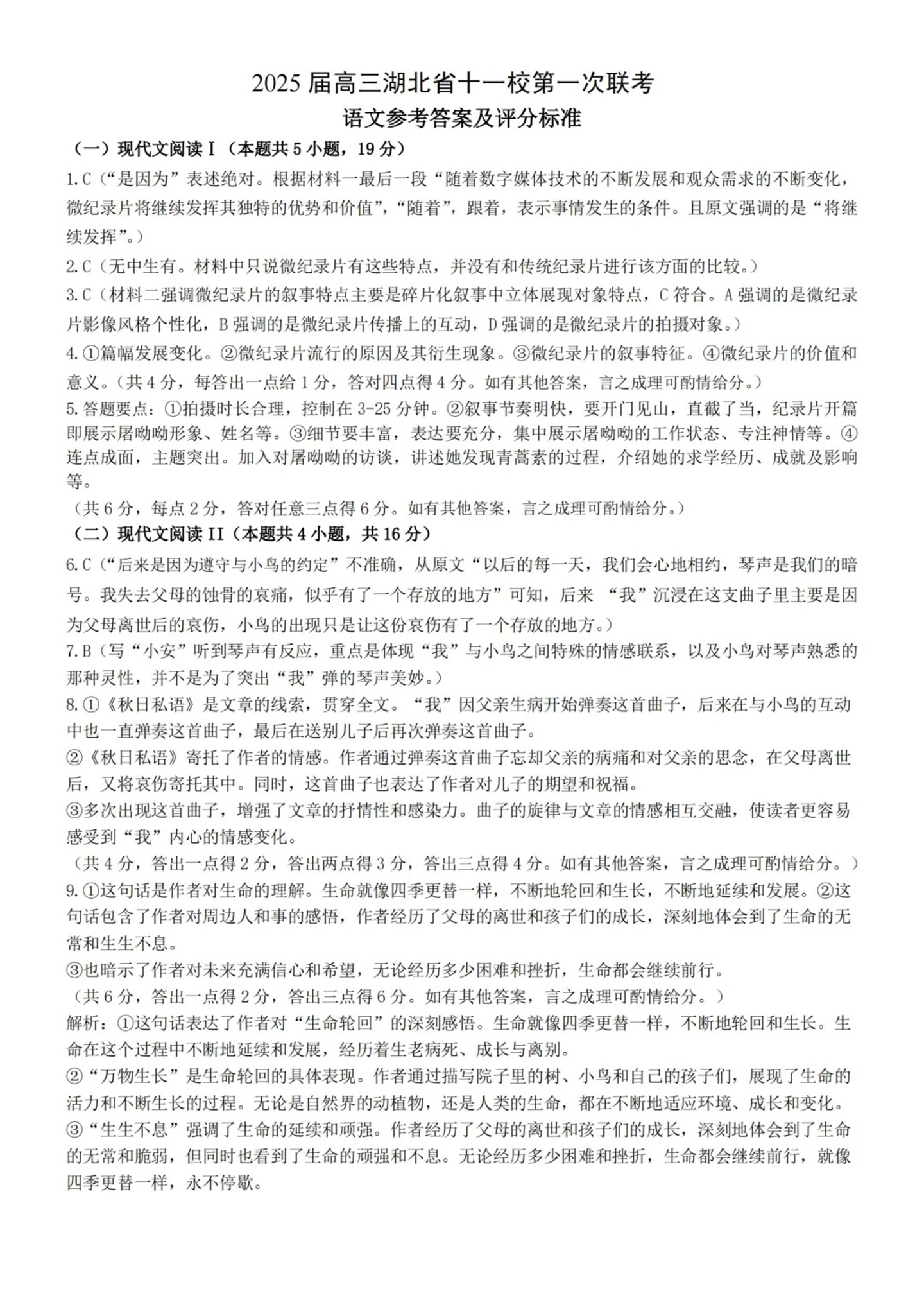 2025届高三湖北省十一校第一次联考 语文答案
