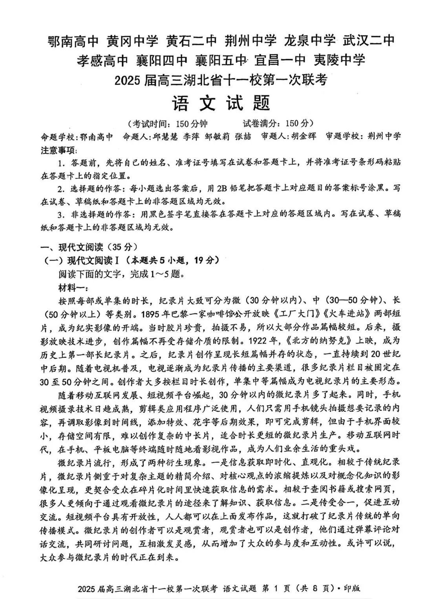 2025届高三湖北省十一校第一次联考 语文