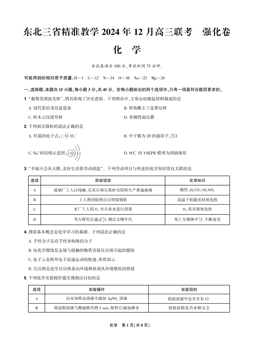 东北三省精准教学2025届高三上学期12月联考(强化卷)化学