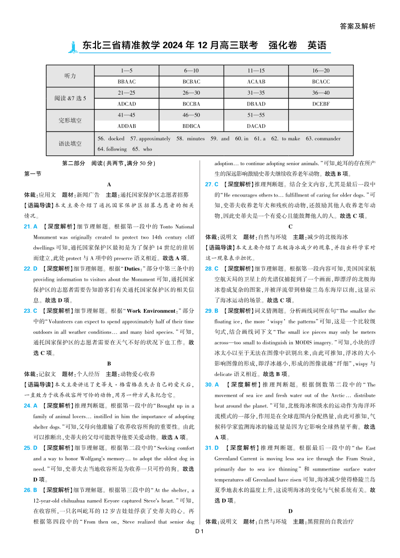 东北三省精准教学2025届高三上学期12月联考(强化卷)英语答案