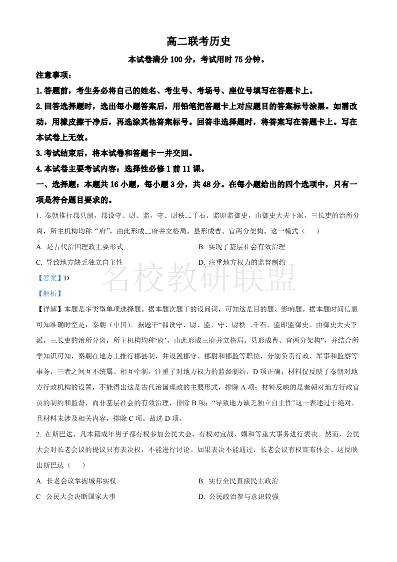 贵州省黔东南州2024-2025学年高二上学期11月期中考试 历史答案