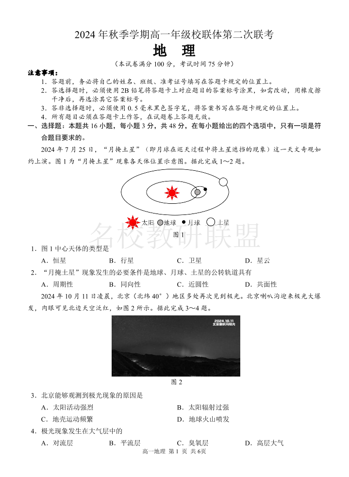 广西河池市2024 年秋季学期高一年级校联体第二次联考 地理