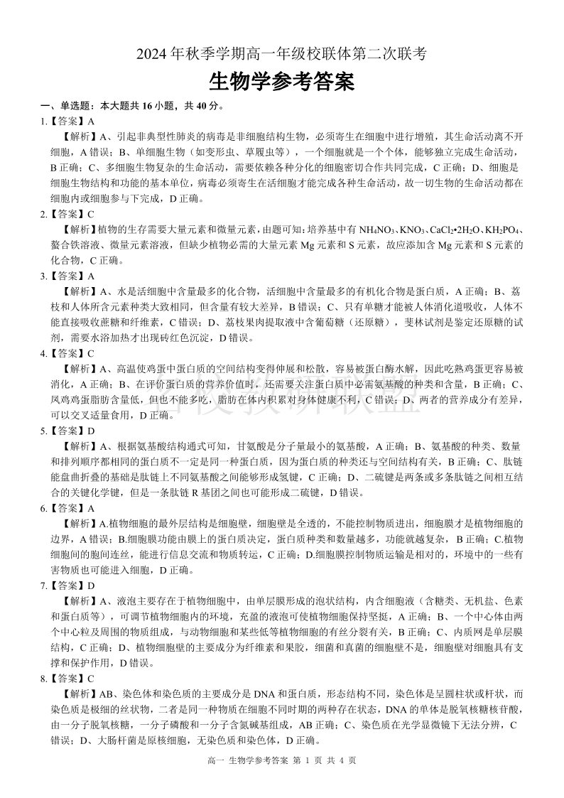 广西河池市2024 年秋季学期高一年级校联体第二次联考 生物答案