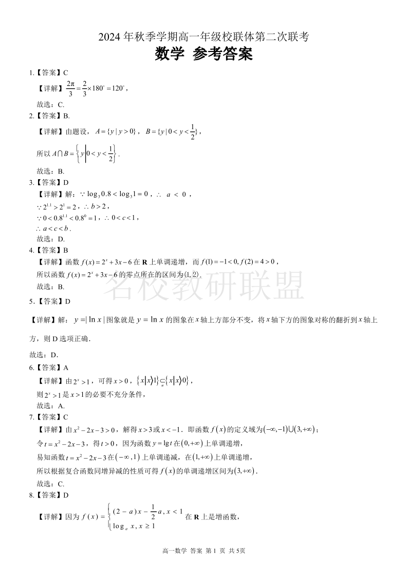 广西河池市2024 年秋季学期高一年级校联体第二次联考 数学答案