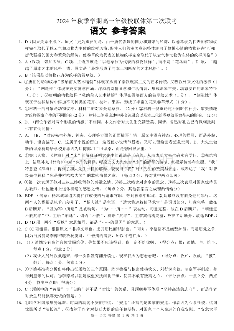 广西河池市2024 年秋季学期高一年级校联体第二次联考 语文答案