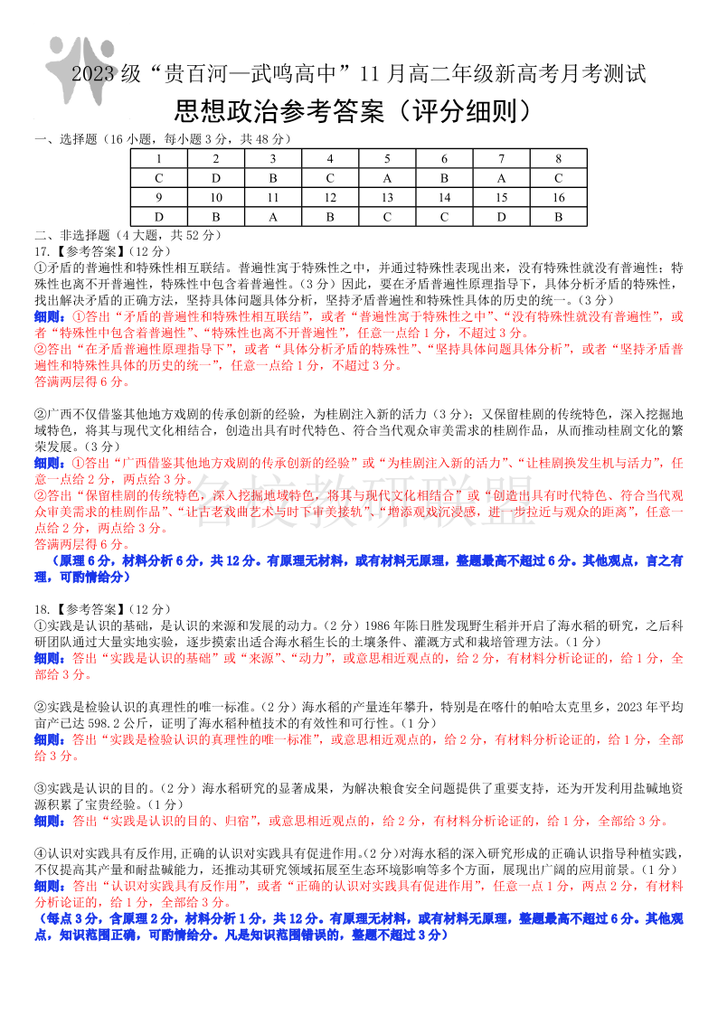 2023级“贵百河—武鸣高中”11月份高二年级新高考月考测试 政治答案