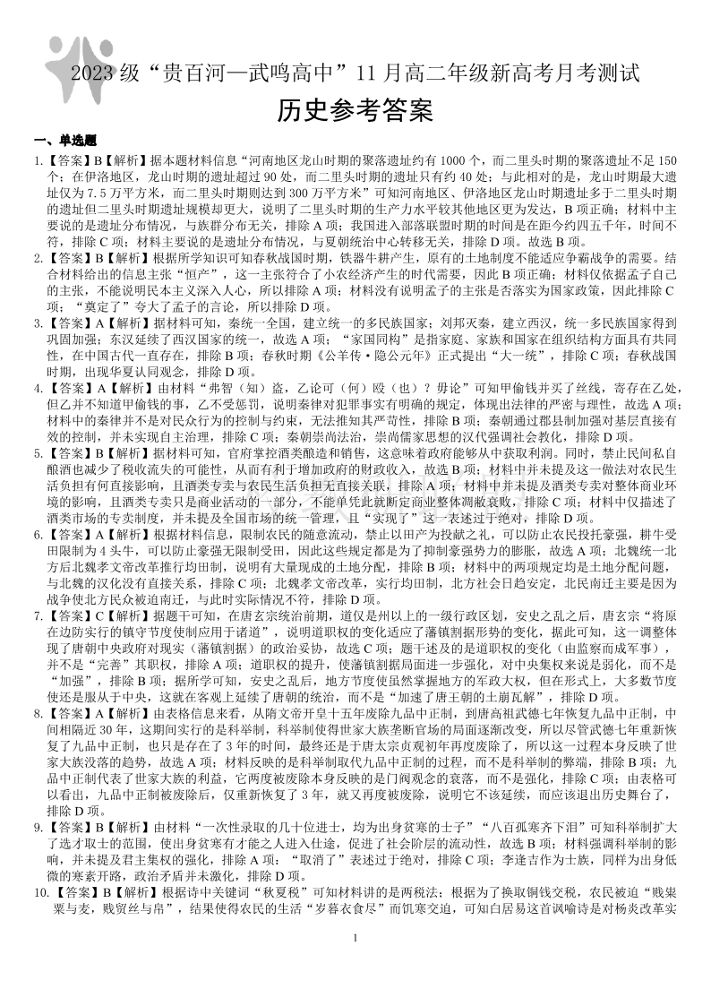 2023级“贵百河—武鸣高中”11月份高二年级新高考月考测试 历史答案