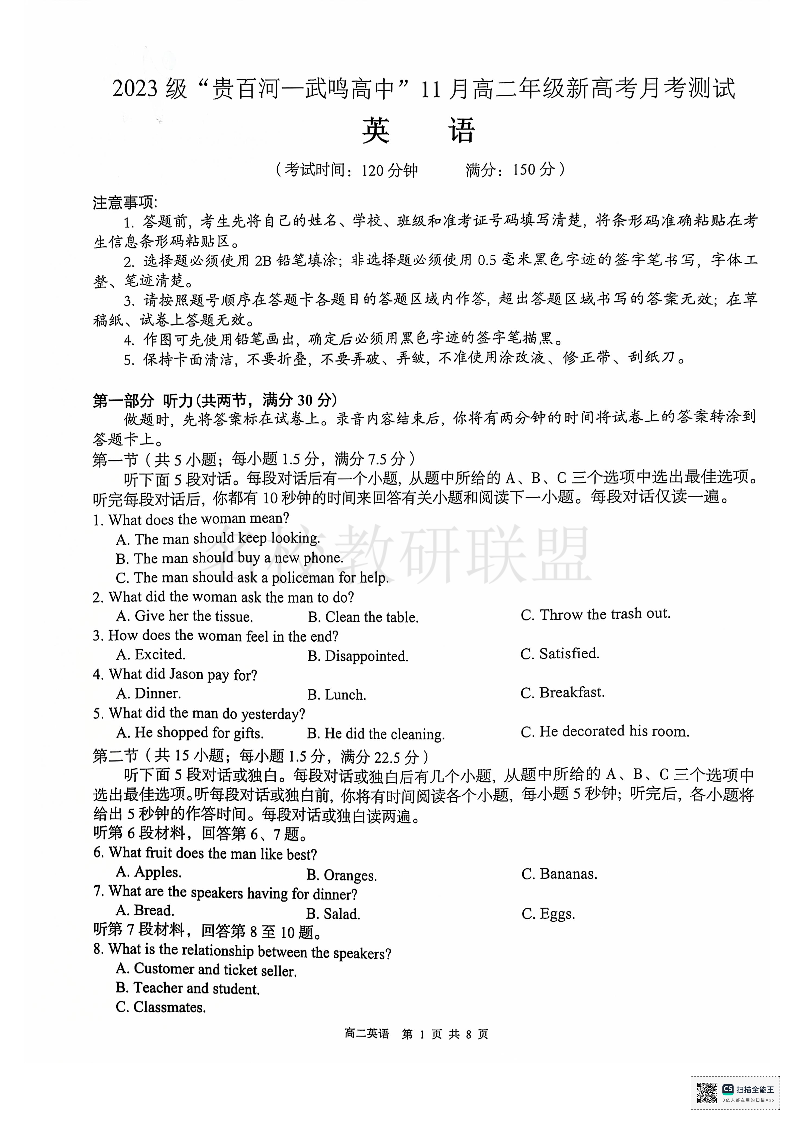 2023级“贵百河—武鸣高中”11月份高二年级新高考月考测试 英语