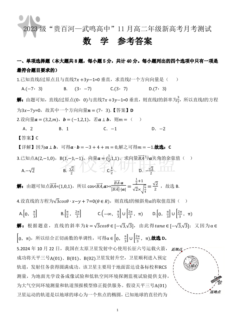 2023级“贵百河—武鸣高中”11月份高二年级新高考月考测试 数学答案