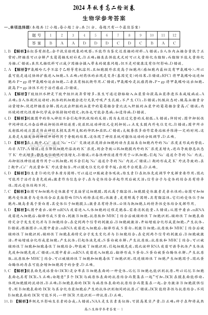 湖南省长郡十八校联盟2024年12月高二联考 生物答案