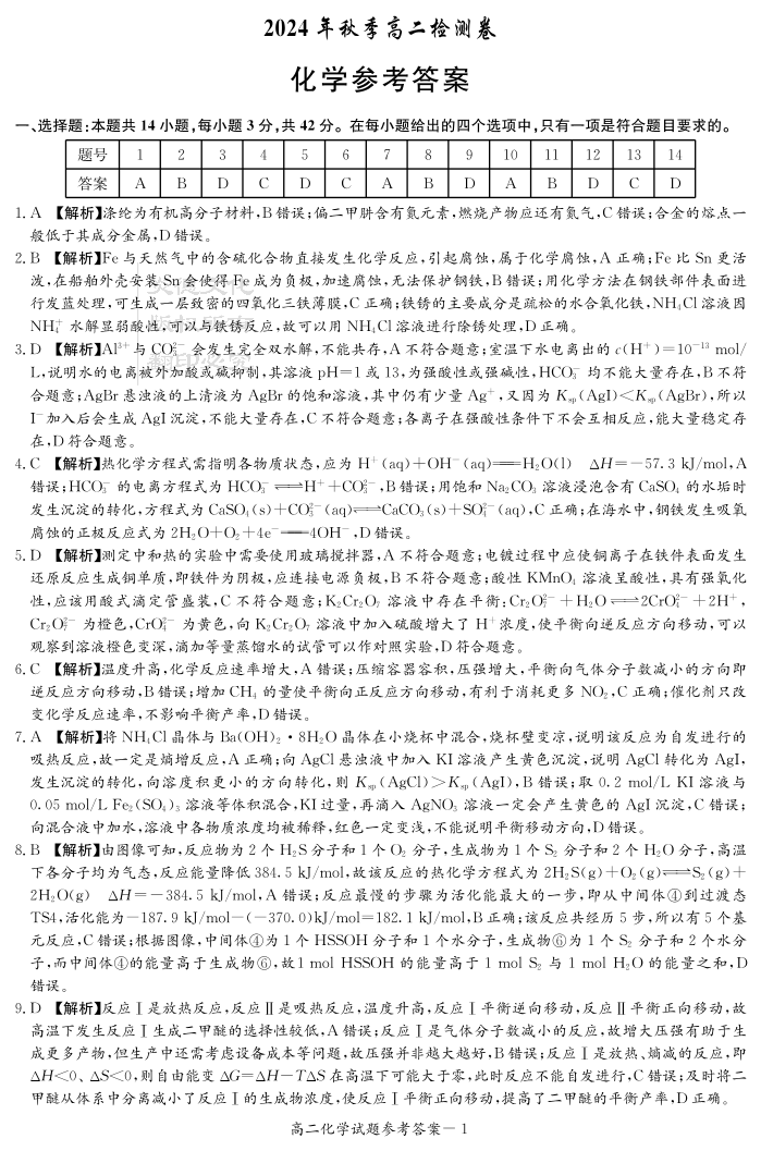 湖南省长郡十八校联盟2024年12月高二联考 化学答案