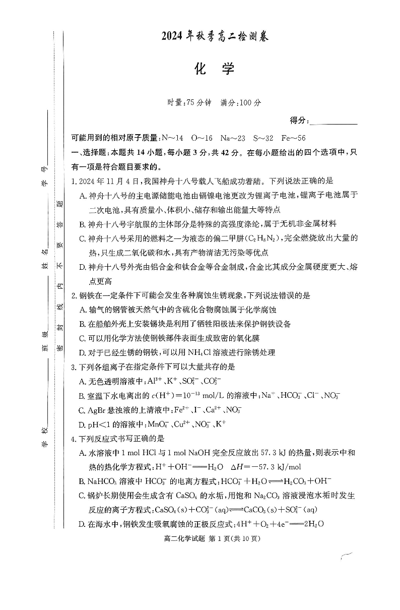 湖南省长郡十八校联盟2024年12月高二联考 化学