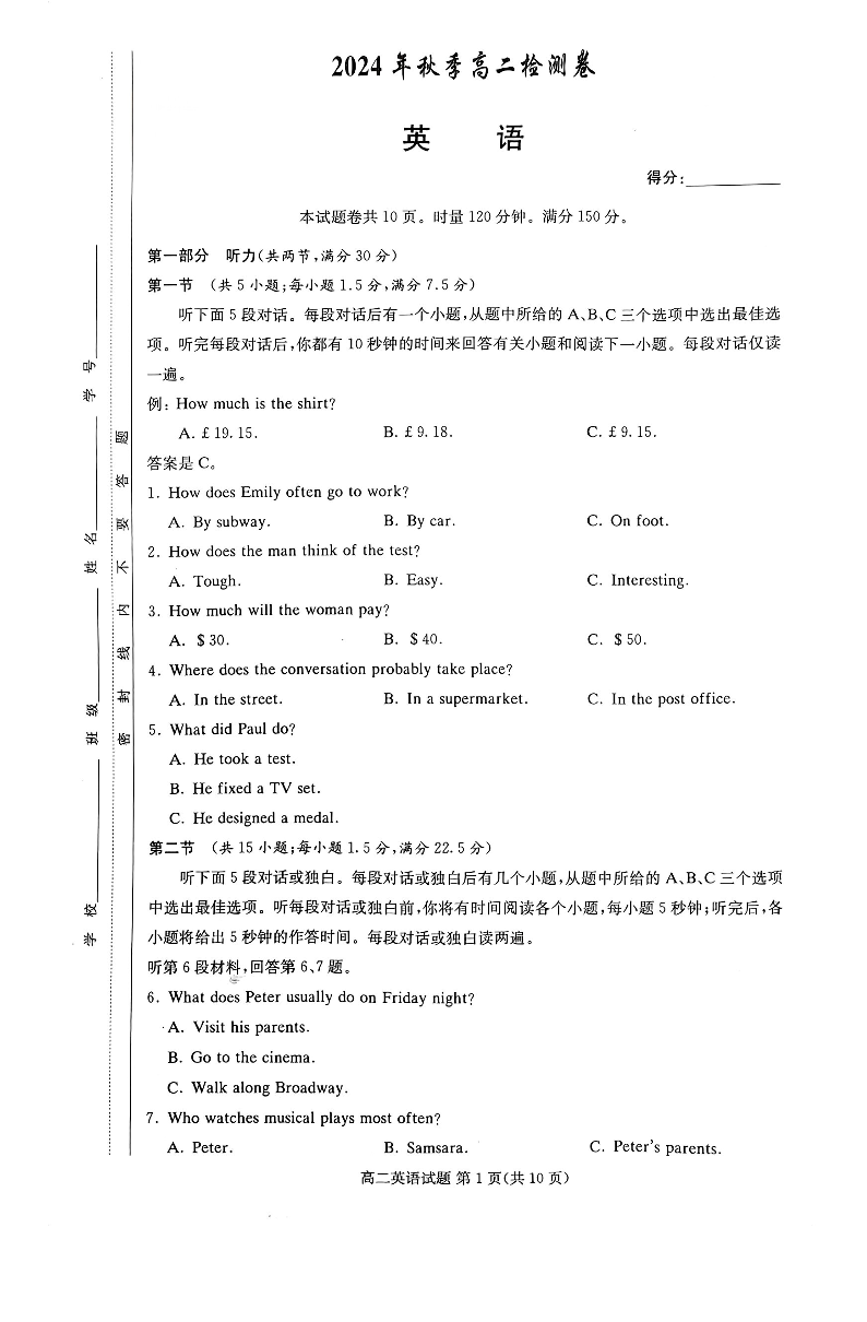 湖南省长郡十八校联盟2024年12月高二联考 英语