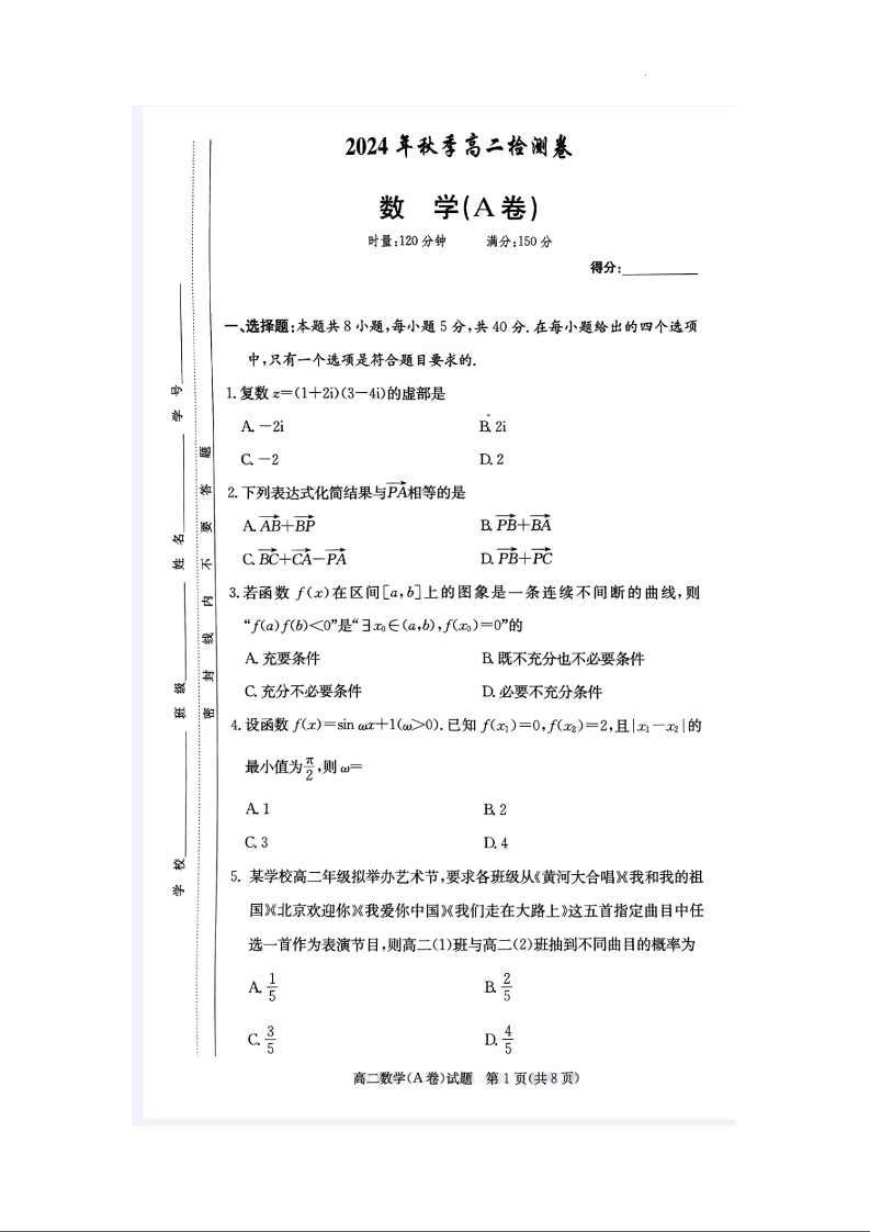 湖南省长郡十八校联盟2024年12月高二联考 数学