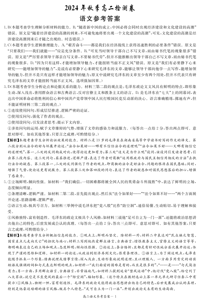 湖南省长郡十八校联盟2024年12月高二联考 语文答案