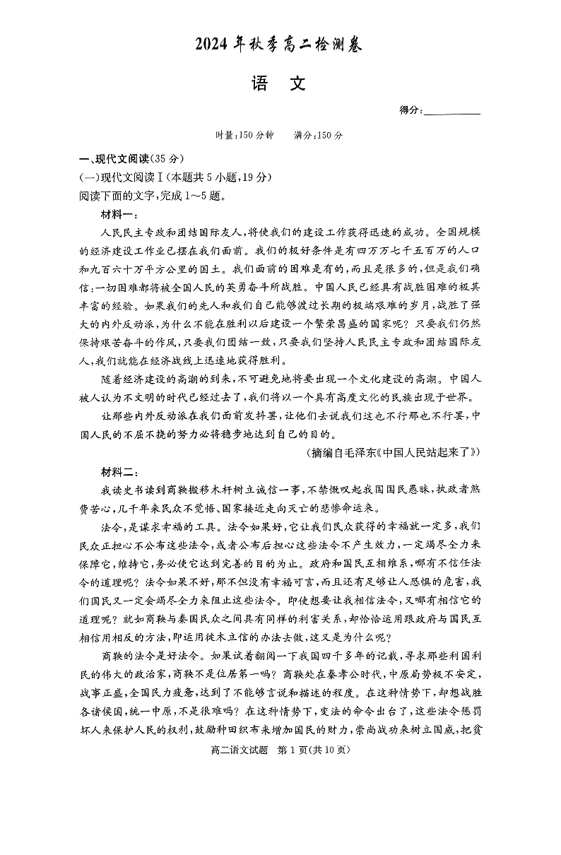 湖南省长郡十八校联盟2024年12月高二联考 语文