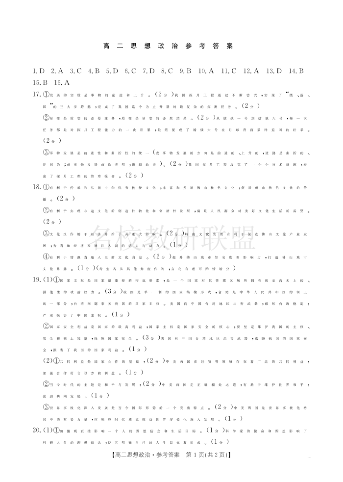 广东省佛山市H7联盟2024-2025学年高二上学期期中联考 政治答案