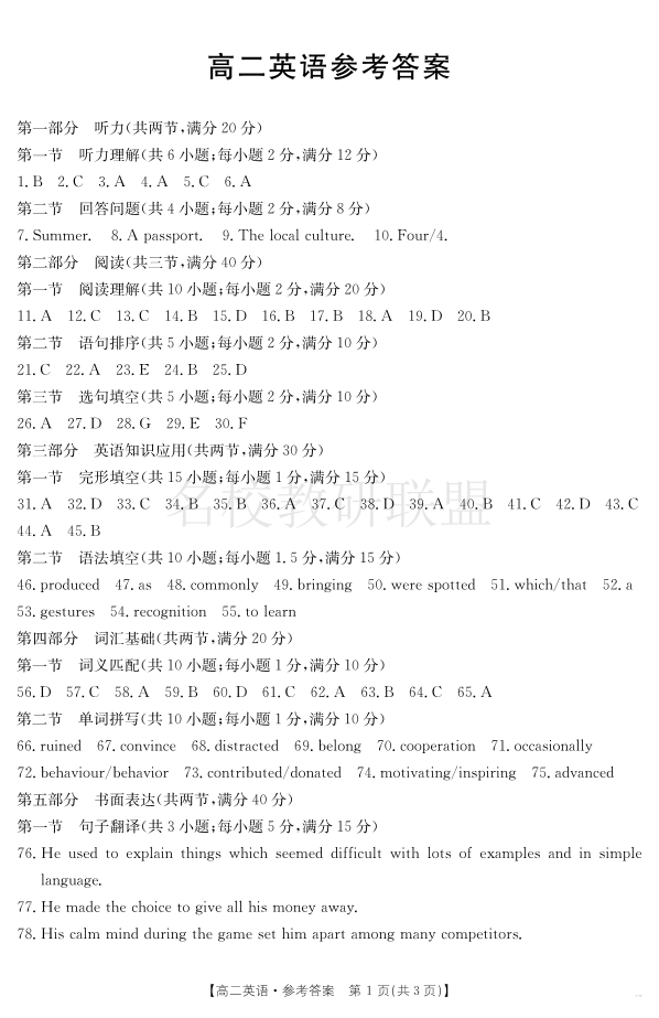 广东省佛山市H7联盟2024-2025学年高二上学期期中联考 英语答案
