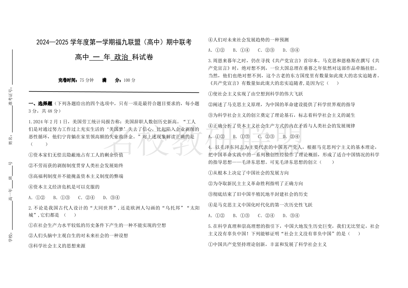 福建省福州九校2024-2025学年高一上学期期11月期中考试 政治