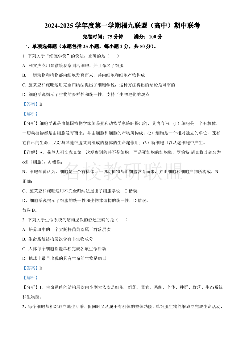 福建省福州九校2024-2025学年高一上学期期11月期中考试 生物