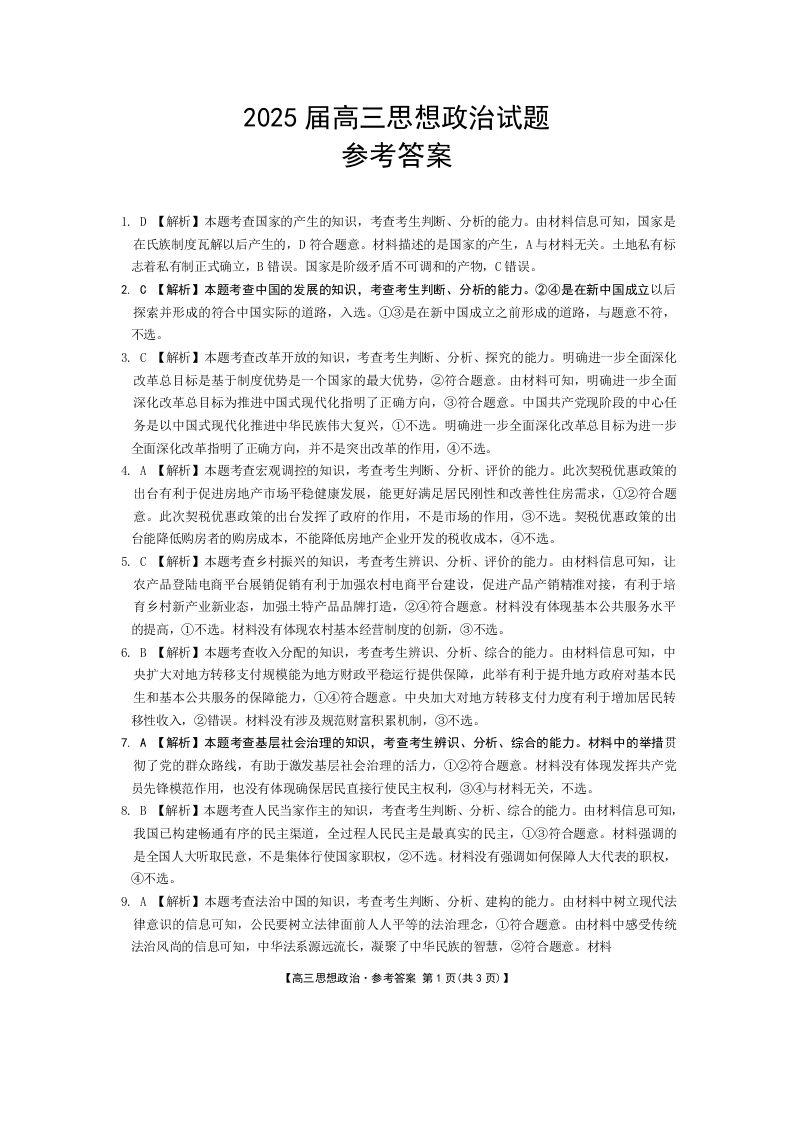 四川省部分学校2024-2025学年高三12月联考 政治答案