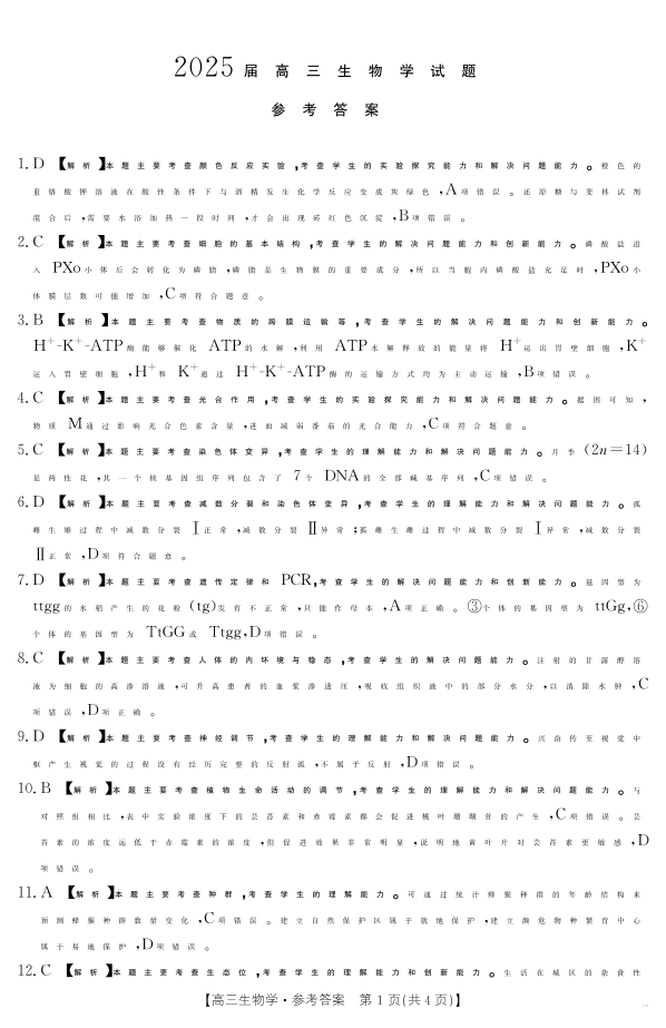 四川省部分学校2024-2025学年高三12月联考 生物答案