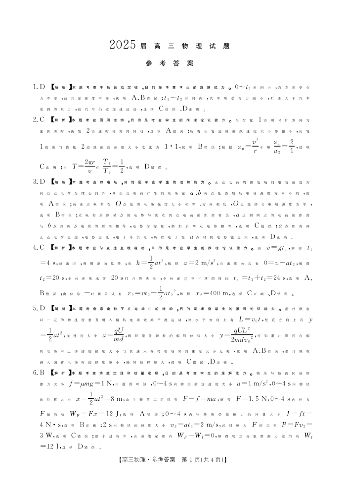 四川省部分学校2024-2025学年高三12月联考 物理答案