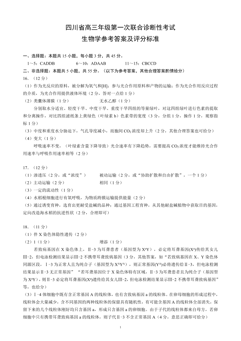 四川省2025届高三年级第一次联合诊断性考试 生物答案
