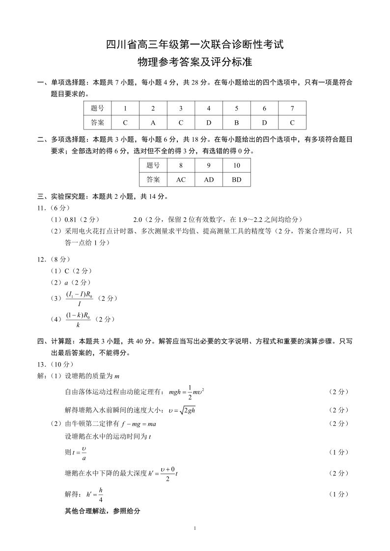 四川省2025届高三年级第一次联合诊断性考试 物理答案