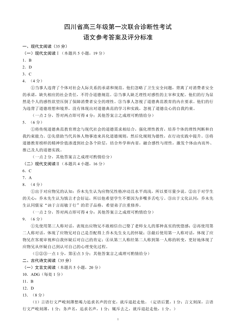 四川省2025届高三年级第一次联合诊断性考试 语文答案
