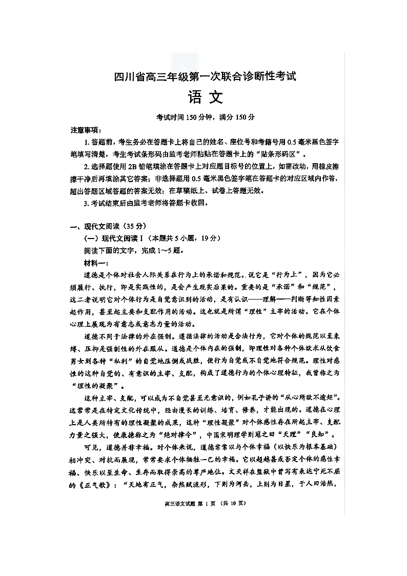 四川省2025届高三年级第一次联合诊断性考试 语文