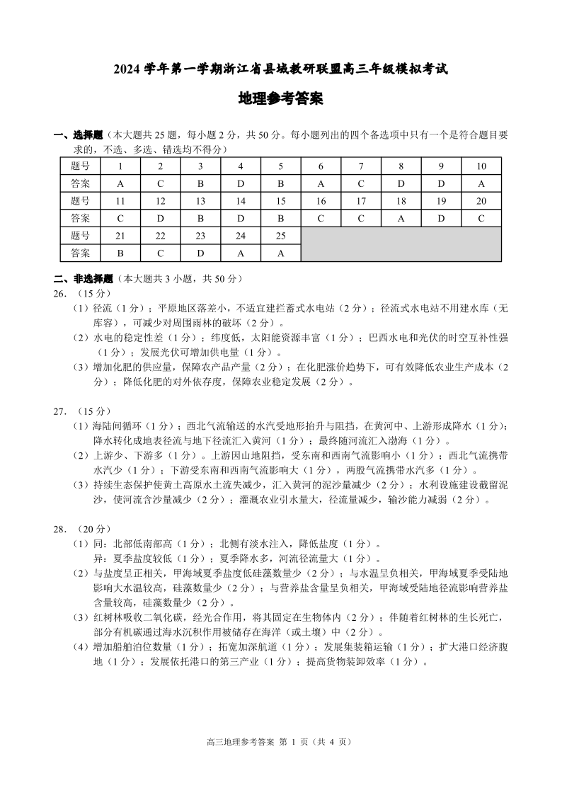 浙江省县域教研联盟2025届高三上学期12月学考模拟考 地理参考答案