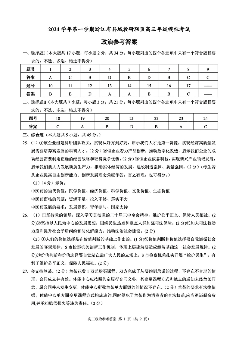 浙江省县域教研联盟2025届高三上学期12月学考模拟考 政治参考答案