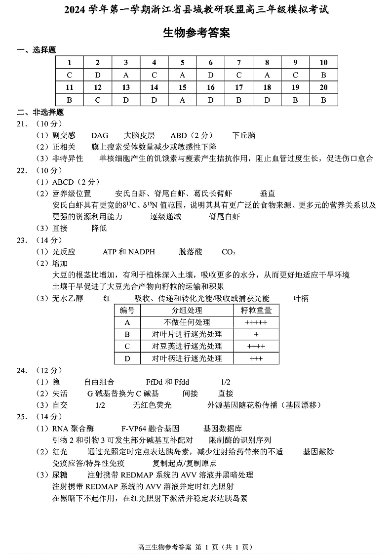 浙江省县域教研联盟2025届高三上学期12月学考模拟考 生物参考答案