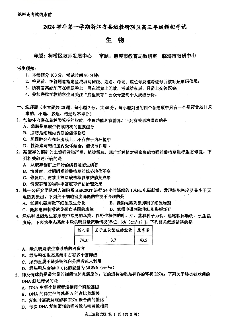 浙江省县域教研联盟2025届高三上学期12月学考模拟考 生物