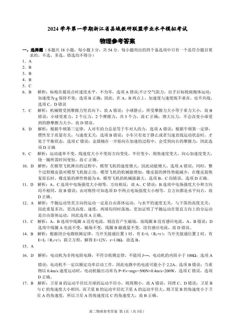 浙江省县域教研联盟2025届高三上学期12月学考模拟考 物理参考答案