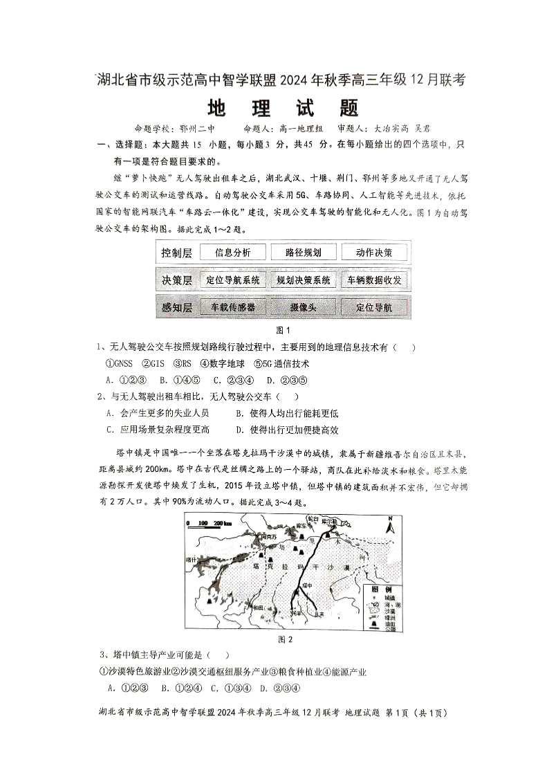 湖北省市级示范高中智学联盟2025届高三12月联考 地理