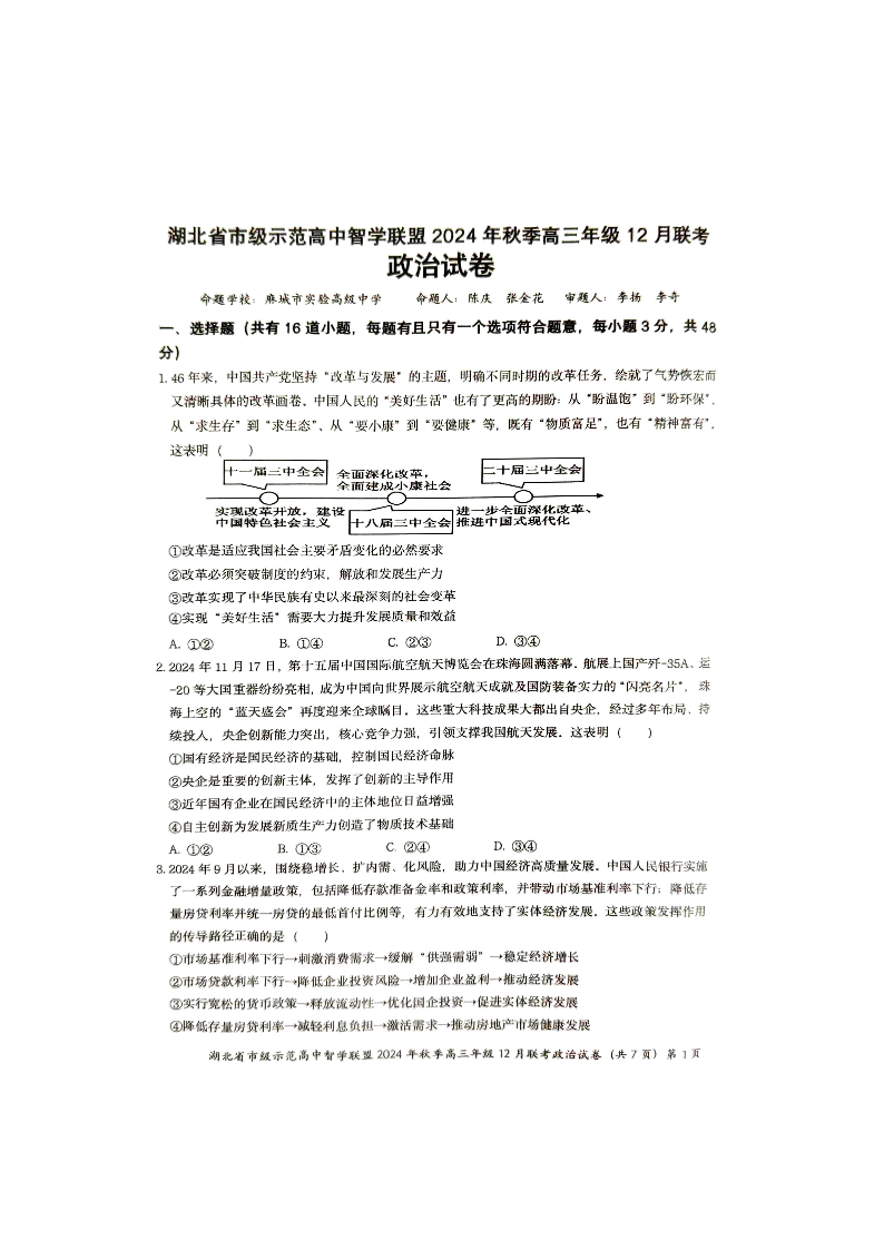 湖北省市级示范高中智学联盟2025届高三12月联考 政治