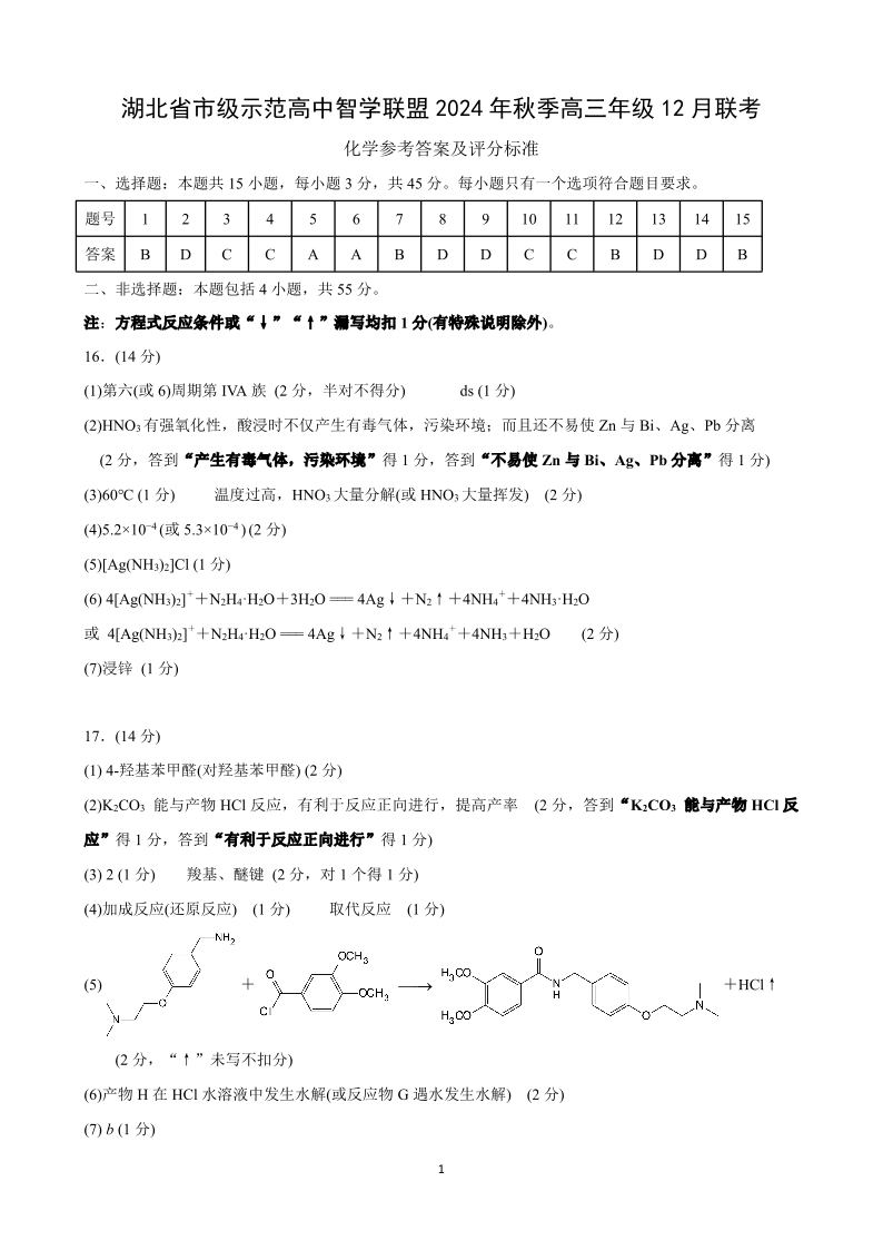 湖北省市级示范高中智学联盟2025届高三12月联考 化学答案