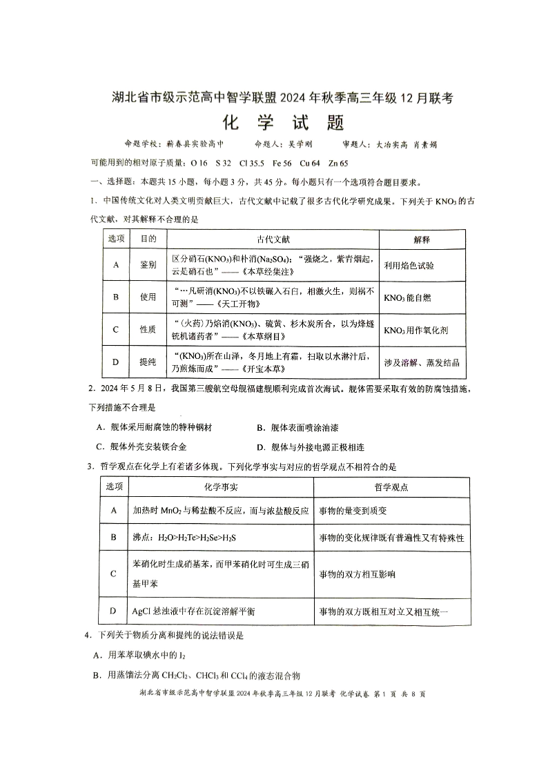 湖北省市级示范高中智学联盟2025届高三12月联考 化学