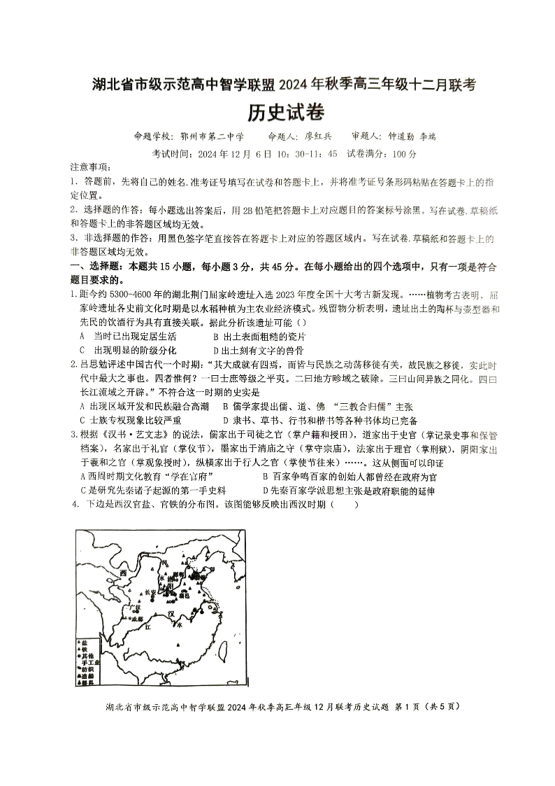 湖北省市级示范高中智学联盟2025届高三12月联考 历史
