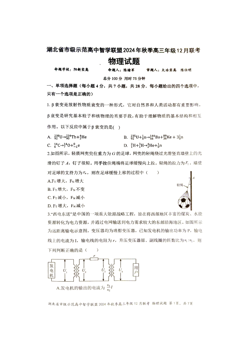 湖北省市级示范高中智学联盟2025届高三12月联考 物理